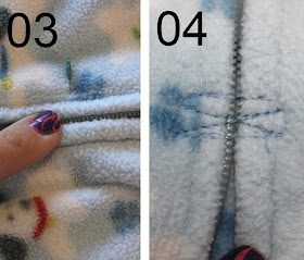Steps 3 & 4:  Now you are going to sew together the zipper where you marked it with the pin.  Make sure your zipper is all the way open before you sew it down. In image 4 you can see that I've tacked it down good.  You don't want your zipper pull to come off when you unzip it.